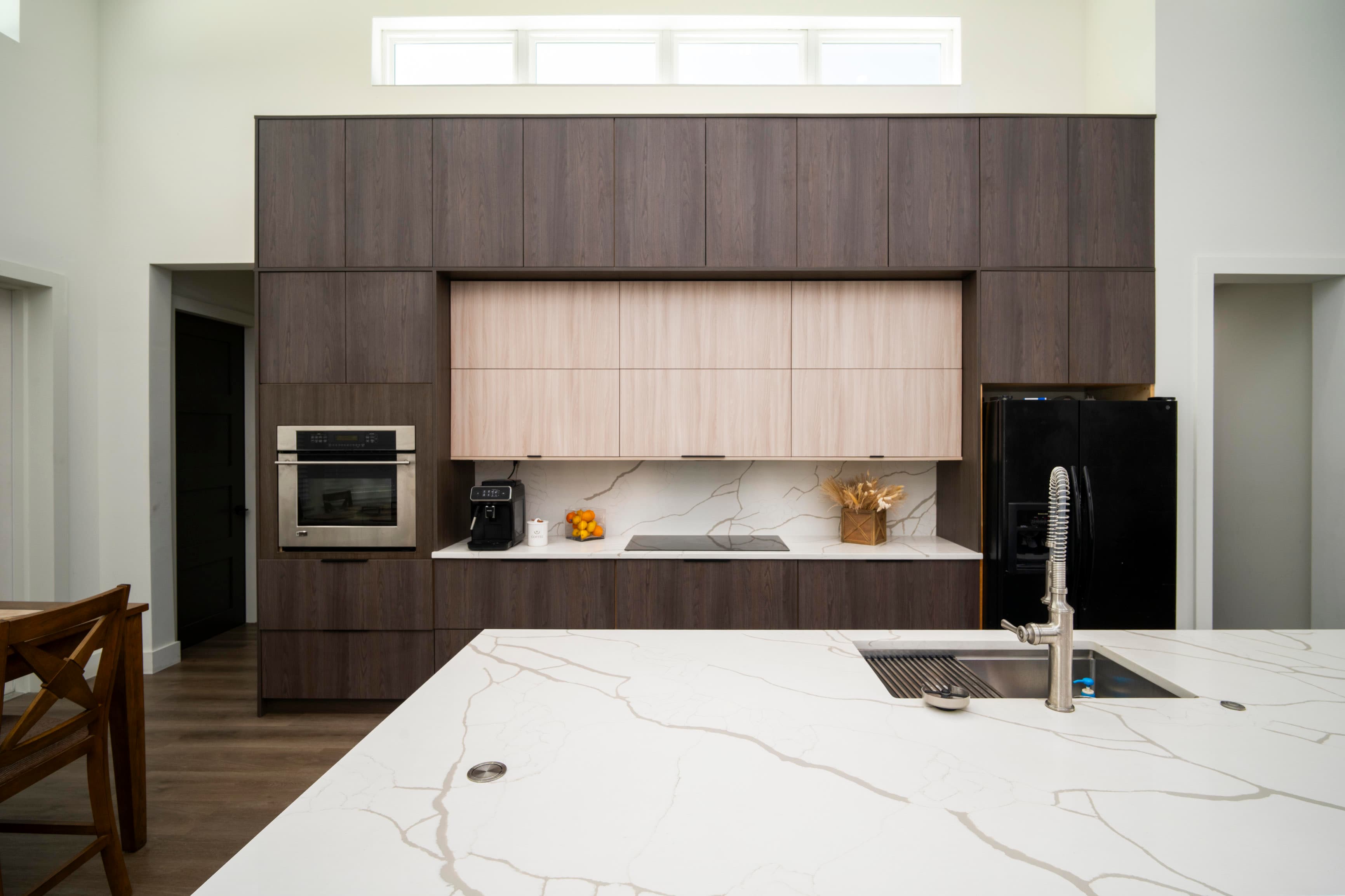 Kitchens, built-ins, fireplace walls, ceiling beams. We measure, build, and install—ready to use when we leave.